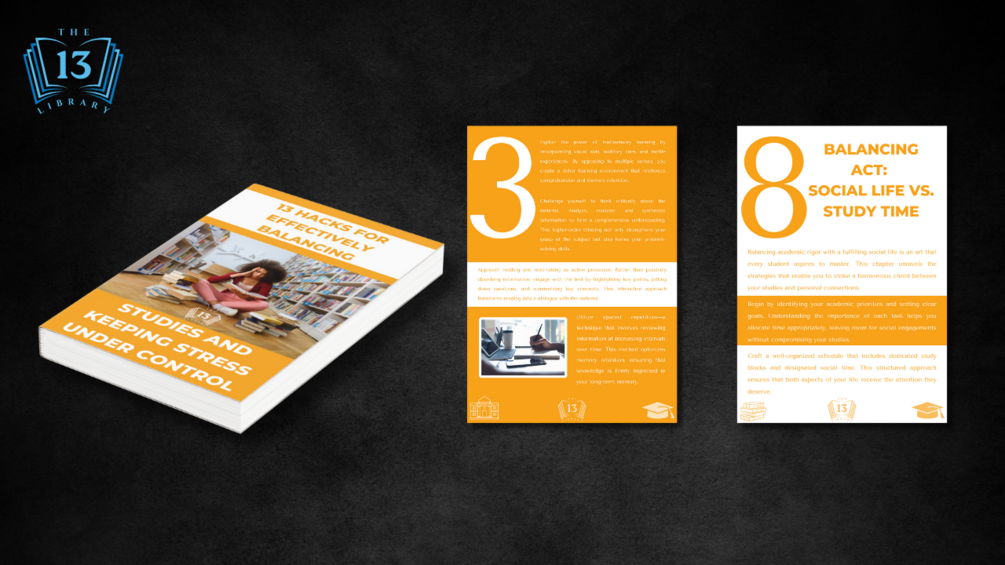 In the hustle and bustle of academic life, maintaining equilibrium between rigorous studies and inner peace can seem like an insurmountable challenge. This e-book, "13 Hacks For Effectively Balancing Studies And Keeping Stress Under Control," offers discreet yet powerful strategies to help you stride through this delicate balance.